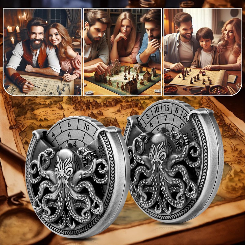 This 7-in-1 metal dnd dice set with roulette cube spinner is characterised by its innovative combination of compass and rolling cubes and offers an incomparably stimulating experience. The spinner features artfully designed hollow octopus pattern. Its eye-catching design is a semi-packed octopus that represents different points on both sides, including D20, D10, D8, D12, D6 and D4.