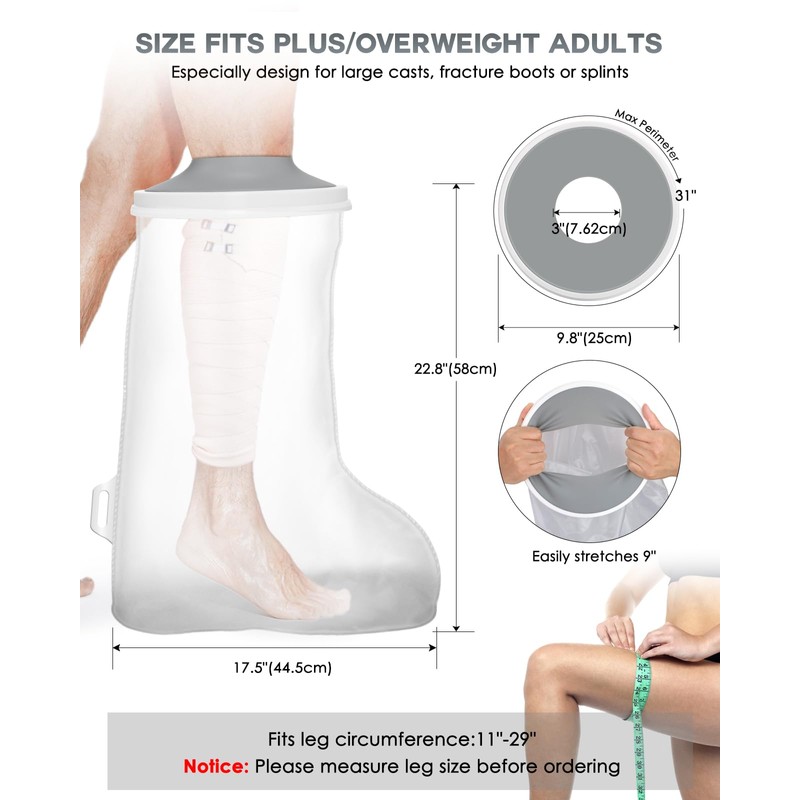 - 🛀EASY TO PUT ON/OFF: The extra-large cast shower cover leg is designed for most plus-size adults, easily stretches over large casts, splints, and medical boots. Item size: 22.8"(L)*17.5"(W). Flexible and comfortable design with extra space for free movement even with bulky surgical boots.