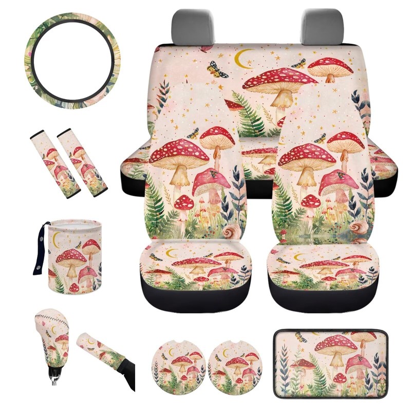 Dngkaoje Mushroom Car Seat Covers Full Set 13 Pcs Butterfly Mushroom Hanging Trash Bag,Seatbelt Pads,Universal Auto Front and Rear Split Bench Seat Covers Set,Auto Seat Accessories