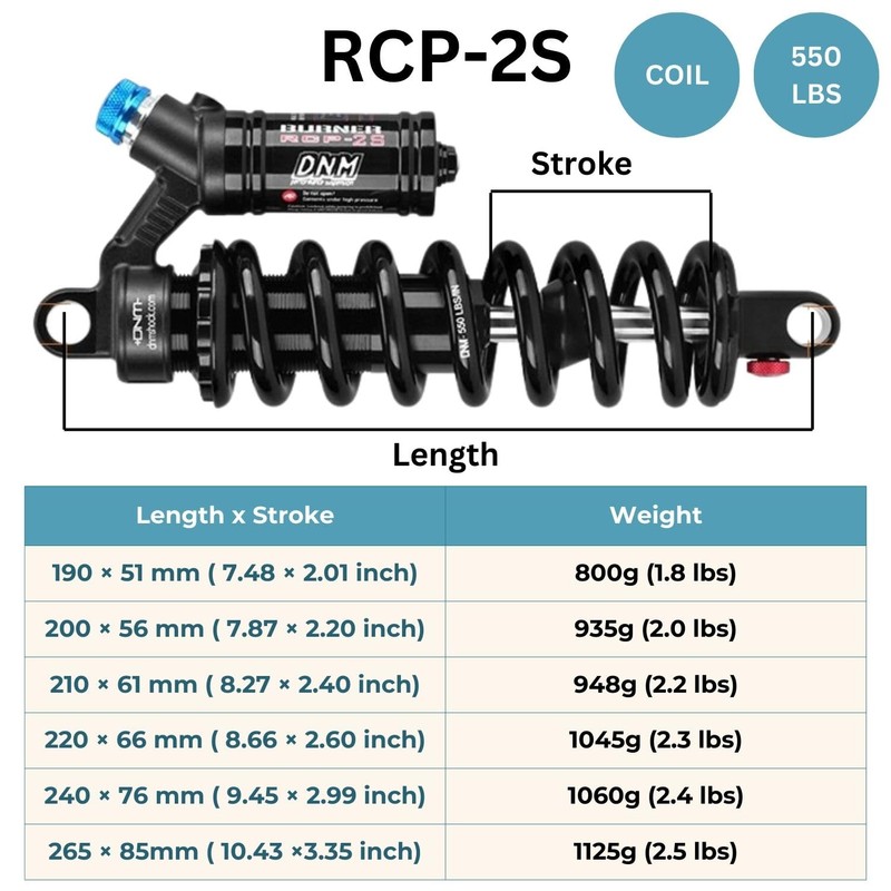 • Models - [DNM RCPS-2S] Coil spring, adjustable rebound/compression/preload, intended for AM FR DH AM/FR/DH/E-BIKE