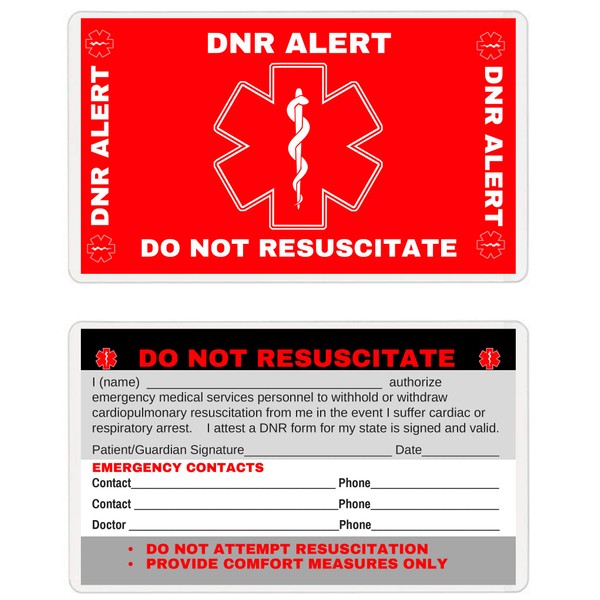 WHY HAVE A DO NOT RESUSCITATE MEDICAL ALERT WALLET CARD In an emergency, First Responders need to know if you have an ACTIVE DNR in order to prevent administering resuscitation procedures. By having this DNR alert wallet card you will prevent any life saving procedures being administered to you. When you are unable to speak for yourself, medical professionals have seconds to evaluate your situation. This DNR - DO NOT RESUSCITATE medical alert card will speak for you. Medical professional are trained to look for identifying medical notifications. This bright red DO NOT RESUSCITATE (DNR) wallet card is stamped with the universal medical alert symbol making it easily identifiable.