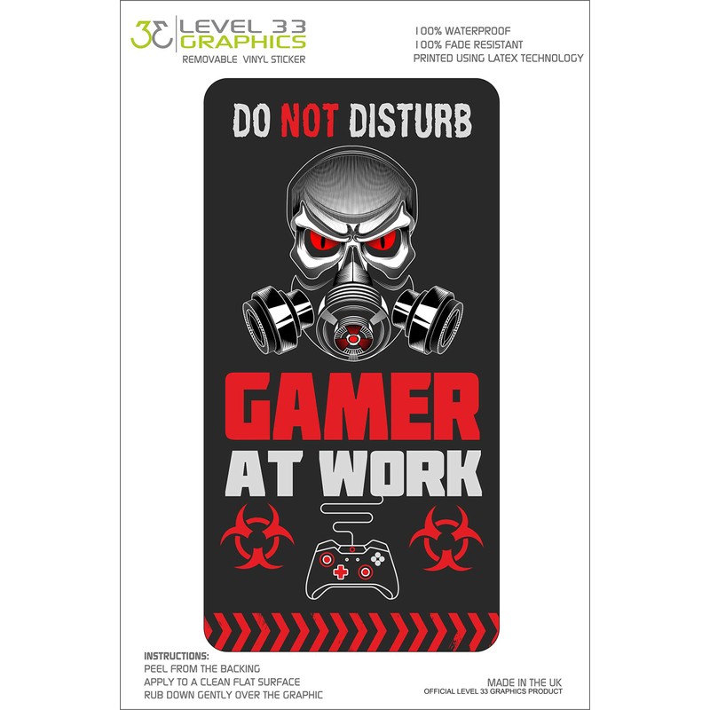 DO NOT DISTURB GAMER AT WORK BIO HAZARD SKULL WALL/WINDOW/DOOR STICKER. Sent in secure branded packaging. Easy to apply. Removable vinyl. High grade sticker. This is a sticker NOT a rigid sign. Made and designed by Level 33.