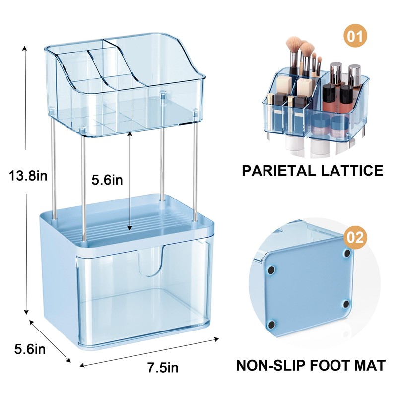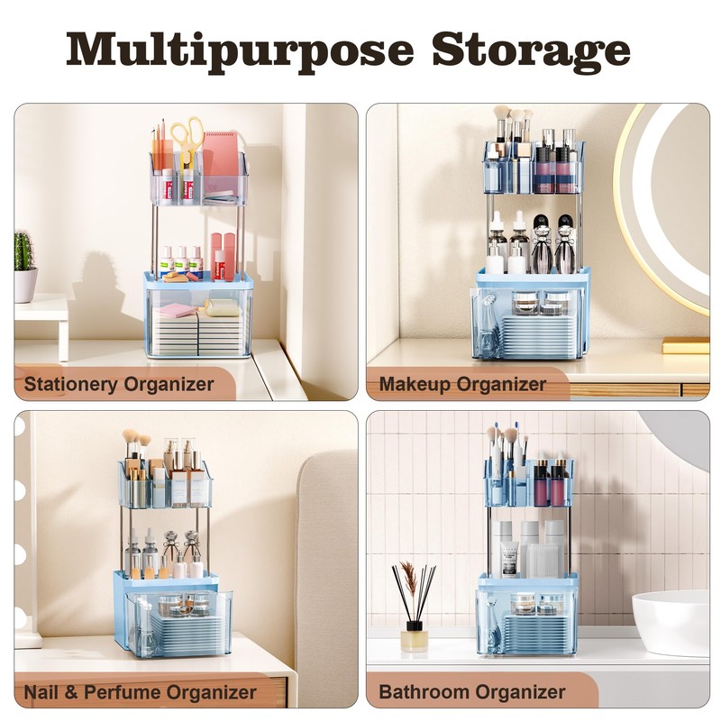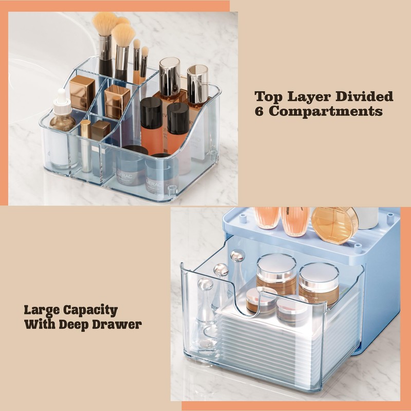 DOADW Makeup Organizer Countertop - 3 Tier Bathroom Organizer Countertop - Multi-Purpose Skin Care Organizer with Drawer for Vanity, Small Cosmetic Counter Organizer (Blue)