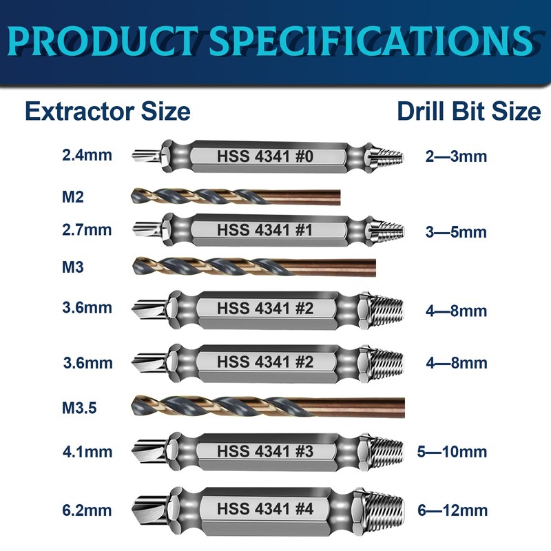 - Versatile Damaged Screw Extractor Set: This DOAHO 9 PCS set includes a complete range of tools for effectively handling stripped or damaged screws. It has 6 PCS HSS 4341 screw extractor remover kit(#0,#1,#2,#2,#3,#4) and 3 PCS HSS 4341 twist drill bit kit(HSS2.0,HSS3.0,HSS3.5)