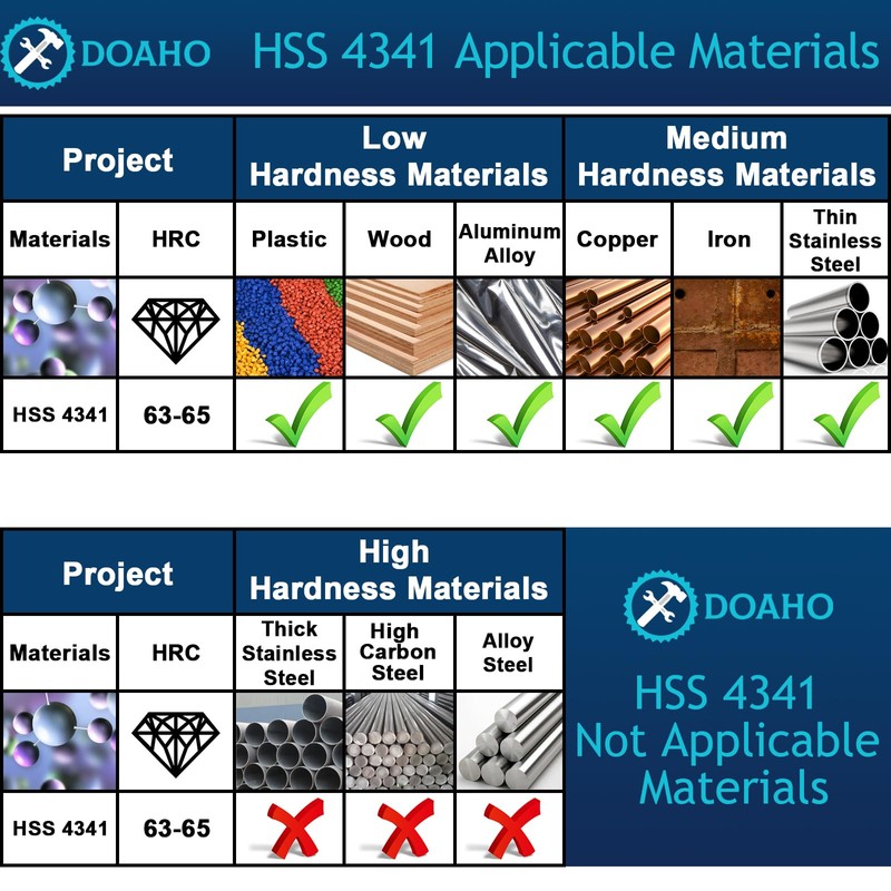 - High-Speed Steel HSS 4341 is suitable for low and medium hardness materials such as plastics, wood, aluminium, copper, iron and thin stainless steel. Not suitable for high hardness materials, such as thick stainless steel, high carbon steel and alloy steel