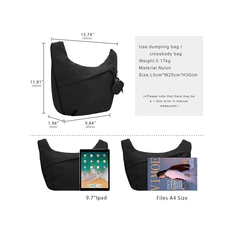 - Casual Dumpling Purse - This shoulder bag is very lightweight, weight 0.39 lbs. Size - 9.84'' X 1.96'' X 11.81''. And the package included Earphone Bag. It's a nylon crossbody bags ideal for shopping、work or travel. And the Package included a bag+coin purse