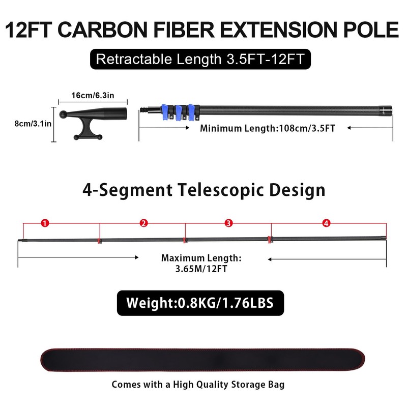 - 【Carbon Fiber Material】Carbon fiber has the higher specific strength and stiffness per density compared to aluminum. Our extension poles are made of carbon fiber material which can providing super high strength and durability, preventing bending and breaking under heavy pressure or harsh environments.Carbon fiber also has the characteristics of corrosion resistance and high temperature resistance