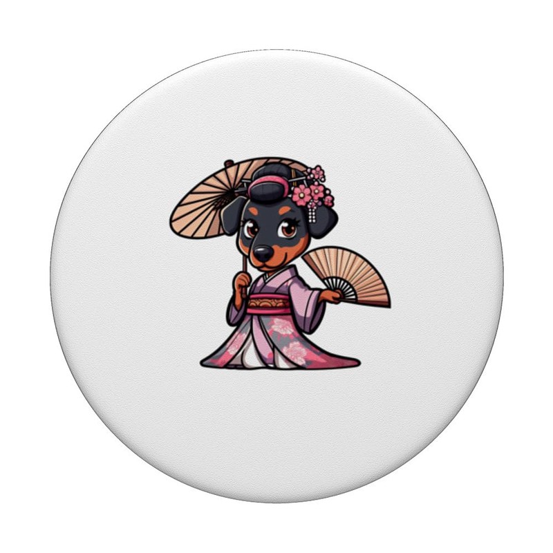 - Step into our delightful world of Doberman Pinscher designs! We feature a cute Doberman Dog dressed in a kimono holding a Japanese umbrella and a fan.