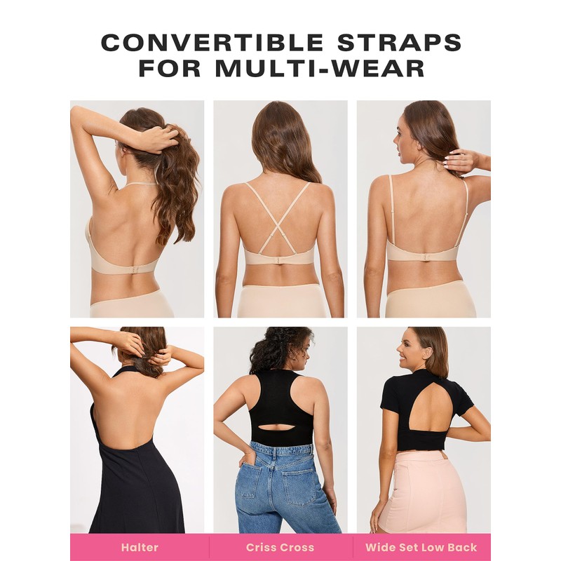 DOBREVA Women's Backless Bra Low Back Halter Lightly Padded T Shirt Bras Underwire Full Coverage Beige 36C