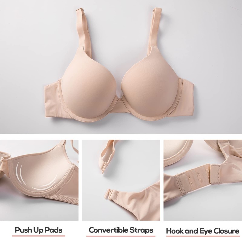 DOBREVA Women's Push Up T-Shirt Bra Underwire Padded Bras Plunge Full Coverage Beige (Band Size is Small. Order 1 Band Size up.) 34AA