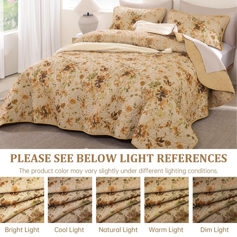 - 【Cozy & Soft Material】This khaki quilt set is made of premium microfiber, lightweight and breathable, creating a peaceful and comfortable sleep experience for you. Exquisite and strong quilting stitches prevents the filling from shifting and make the floral quilt more durable.