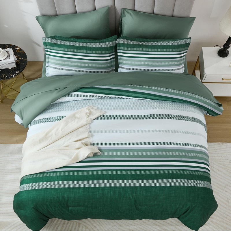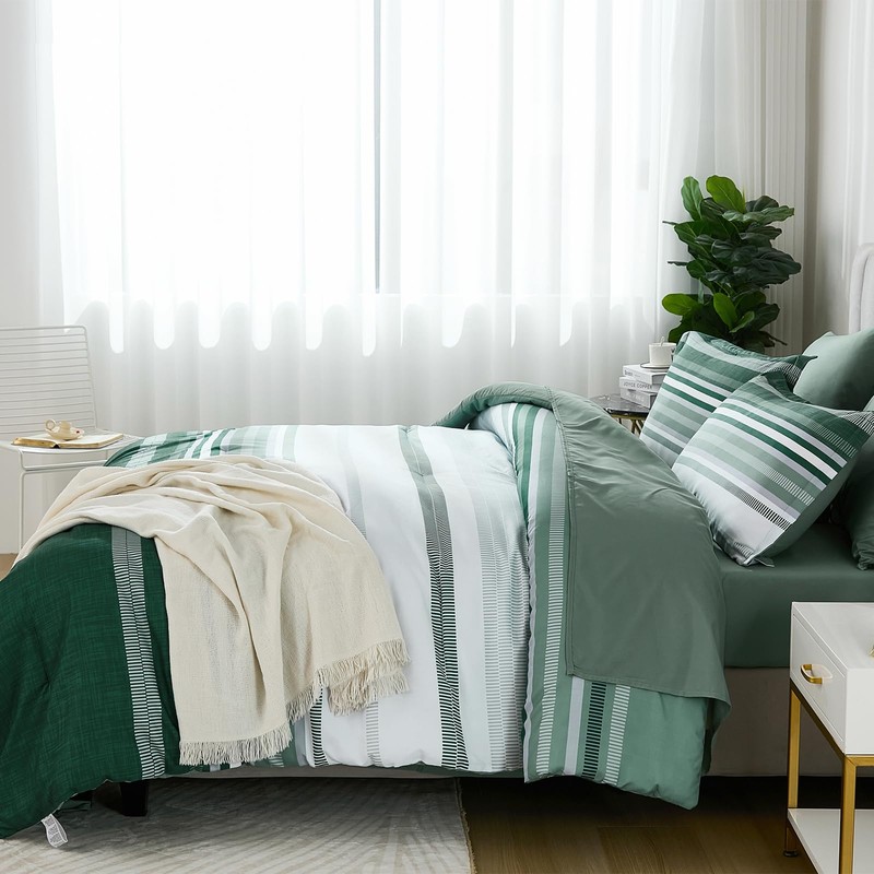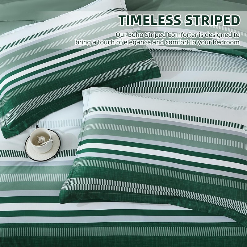 Dobuyly Green King Size Comforter Set 7 Pieces, Boho Striped Bed in a Bag Soft Microfiber All Season Bedding Set with Comforter, Sheets, Pillowcases & Shams