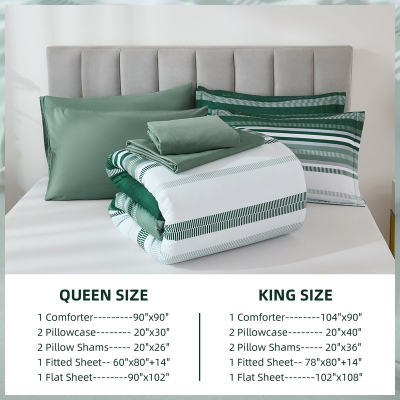 - 【What You Will Get】: This 7 pieces king size bed in a bag set includes 1 comforter (104” x 90”), 1 flat sheet (102" x 108"), 1 fitted sheet (78" x 80" + 14"), 2 pillowcases (20” x 40”) and 2 pillow shams (20" x 36").