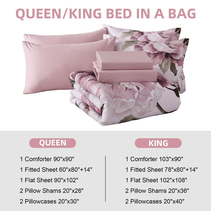 - 【What You Can Get】7 pieces queen bed in a bag set includes 1 floral comforter 90" x 90",1 flat sheet 90"x 102",1 fitted sheet 60"x 80"+14",2 pillow shams 20" x 26",2 pillowcases 20"x 30". NOTE: Pillow insert is not included.
