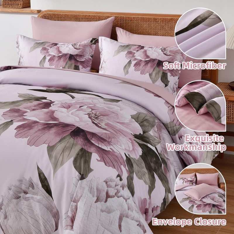 - 【Exquisite Craftsmanship】This floral comforter set queen uses whole piece of premium and well-distributed polyester as the inner filling which makes the comforter more soft and warm. The pink floral bedding set uses a excellent stitching technology to prevent the filling from shifting and clumping.