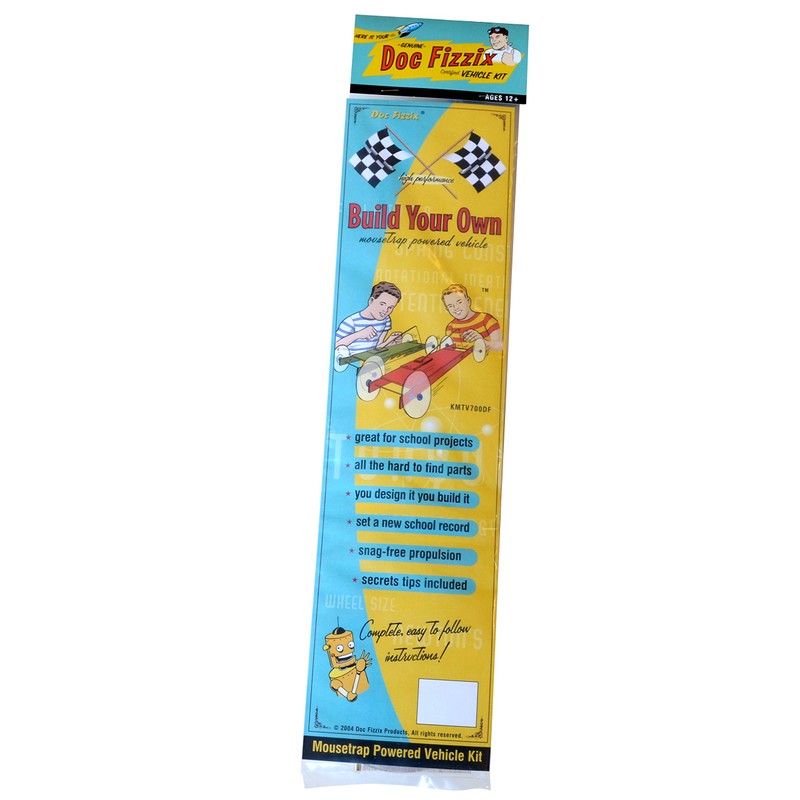 Not a kit, but a collection of all the hard-to-find parts and accessories in one package. Perfect for those who cannot use a kit and/or for those who want to design and build their own mousetrap racer from scratch. Includes a top secret builder's guide filled with performance tips and tricks. The Build Your Own Kits is a complete do-it-yourself mousetrap racer kit that includes all the hard-to-find parts for building your very own mousetrap powered racer. You could spend all day trying to find all the parts that are in this kit and still probably never locate everything. The Build Your Own Kit comes with all the top secret components that are used on many of Doc Fizzix's own mousetrap racers including the impossible and hard-to-find DVD-Layers that have half the rotational inertia of a normal CD, eight DVD/CD spacers, and a full meter of ultra thin Kevlar string. The wood is not pre-drilled so builders can design their own cars from scratch.