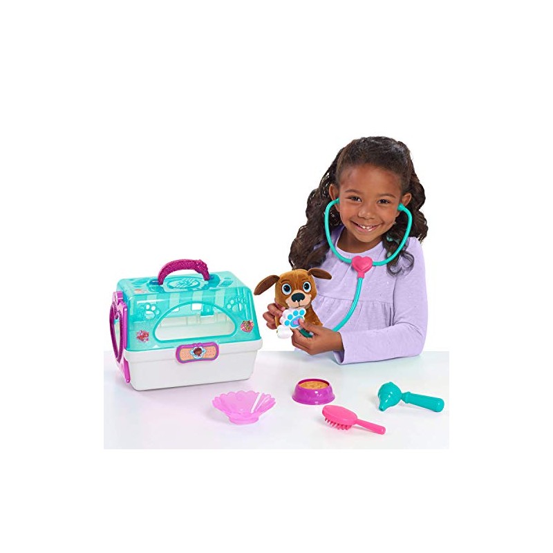 - Help your furry friends feel their best with on-the-go checkups. The new Toy Hospita lOn-the-Go Pet Vet Carrier from Disney Junior's Doc McStuffins comes with a loveable plush pet Findo. The carrier has a brand new look featuring fun glittered accents and a see through top to help you perform check-ups in style. The carrier holds every tool you need to take great care of your precious pet pal, including a stethoscope, pet hair brush, otoscope, and a 2-in-1 water and food bowl