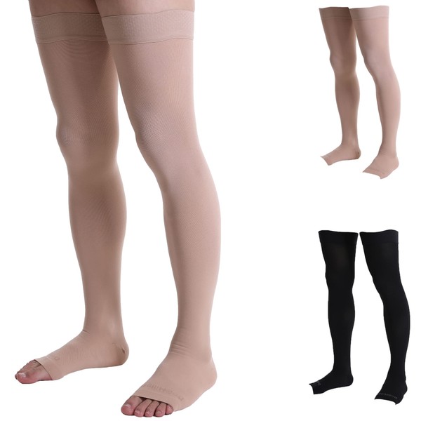 Doc Miller - Manguera de compresión para muslo y puntera abierta, 20-30 mmHg, opaca medias (beige, extragrande)