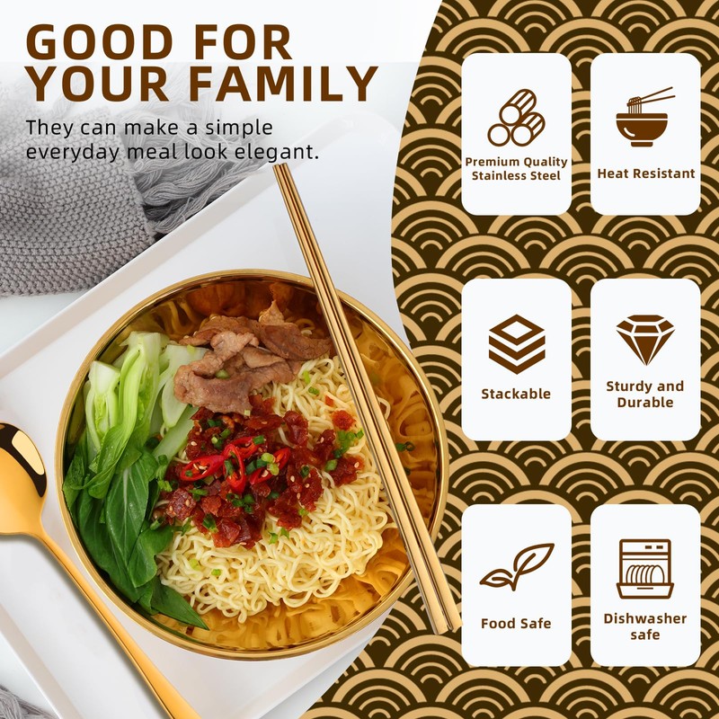 - 🍜 【HIGH QUALITY】 - Our Ramen Bowl Set is made from food grade stainless steel. Smooth surface and mirror polish makes these soup bowl sets always keep shining, extra careful polishing of all the edges.