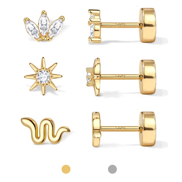 Dochais Flat Back Stud Earrings for Women and Men, Hypoallergenic 14k Gold Plated 925 Sterling Silver Post Stud Earrings Set, Gold and Silver Earrings with Screw for Sensitive Ears, Ideal for Helix, Tragus, and Cartilage Piercings (10586-G4)