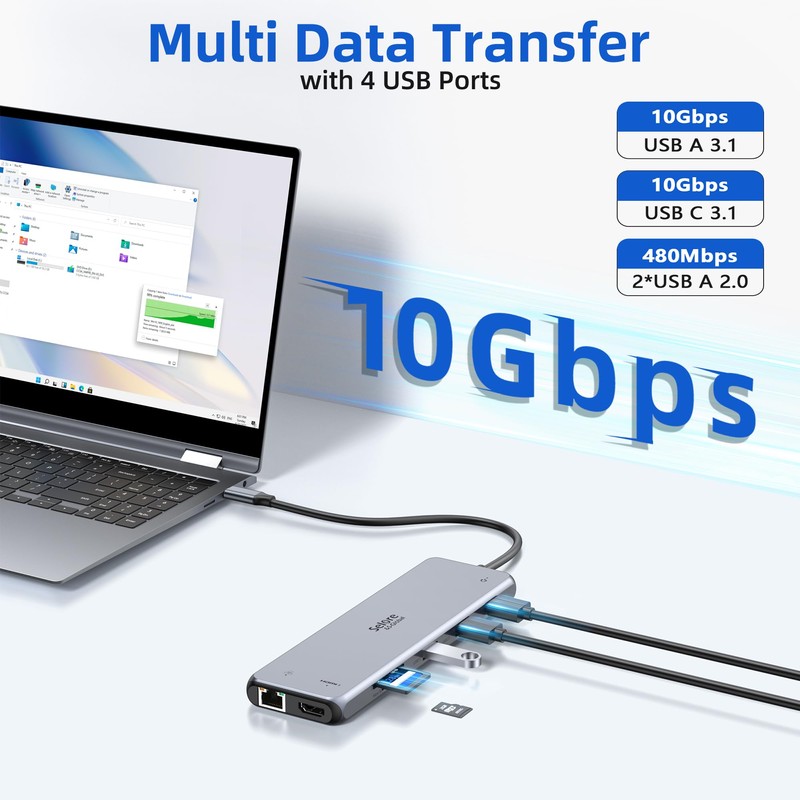 - 10Gbps transmission and Gigabit Ethernet: with USB 3.1-C and USB 3.1-A ports (up to 10Gbp/s), the docking station 3 monitor allows you to quickly transfer large files in a short time. 2 USB 2.0 ports are suitable for mouse keyboard. The USB C Docking Station Dual HDMI is equipped with a high-speed Gigabit Ethernet port, which ensures a stable and smooth network connection. Remote work, online meetings, everything is under control.