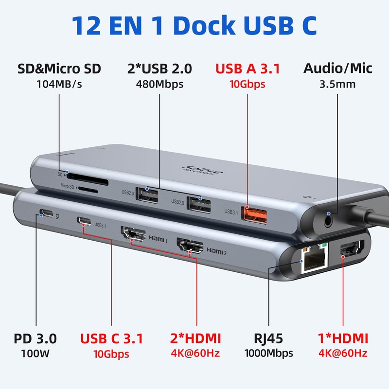 - 4K triple HDMI docking station: the USB C docking station is equipped with 3 x 4K HDMI, 2 x USB C/A 3.1 10 Gbps, 2 x USB 2.0, 100 W USB C PD port, Gigabit Ethernet, 3.5 mm audio port and SD/TF card reader. Docking Station 3 monitors HDMI is plug and play and makes your office life more efficient and convenient! The powerful connection combination overcomes connection restrictions and makes your workspace clearer.