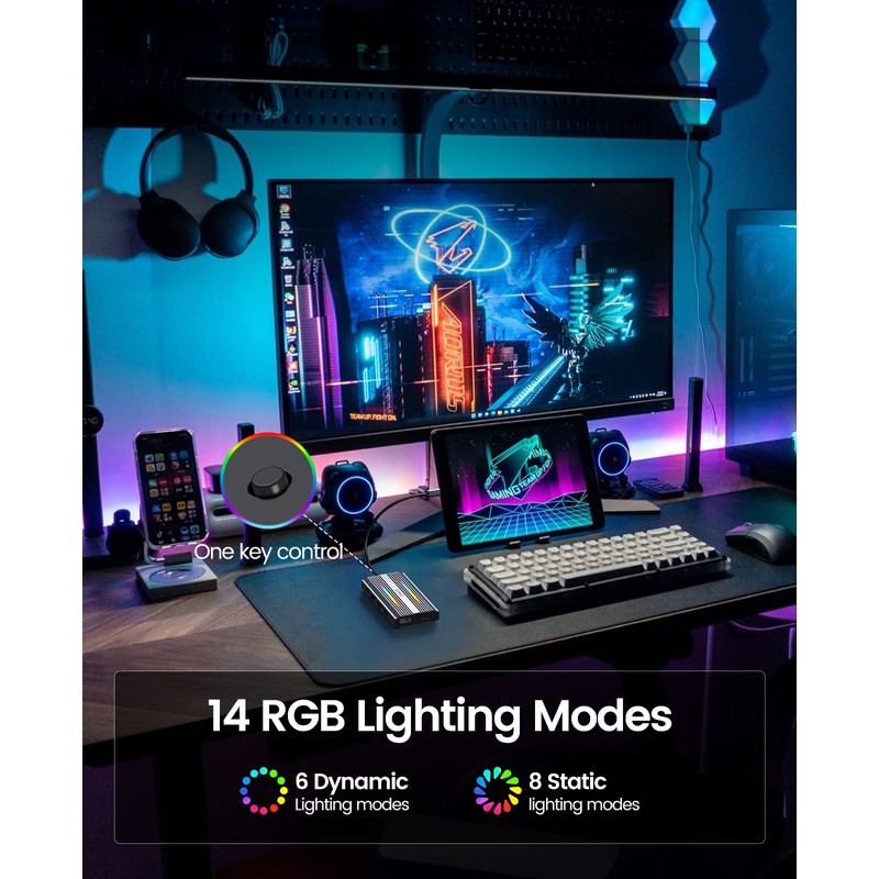 - 【14 RGB Lighting Modes】The Type C Hub comes with RGB lights, support independent button adjustment, with 14 lighting modes, including colorful 6 dynamic breathing lighting mode and 8 monochrome static lighting mode, can be perfectly matched with your desktop or other rgb mouse, keyboard, etc. When you do not want the RGB light, long press 6 seconds to turn off the rgb light.With power-off memory function, automatically remember the last use of the light mode.