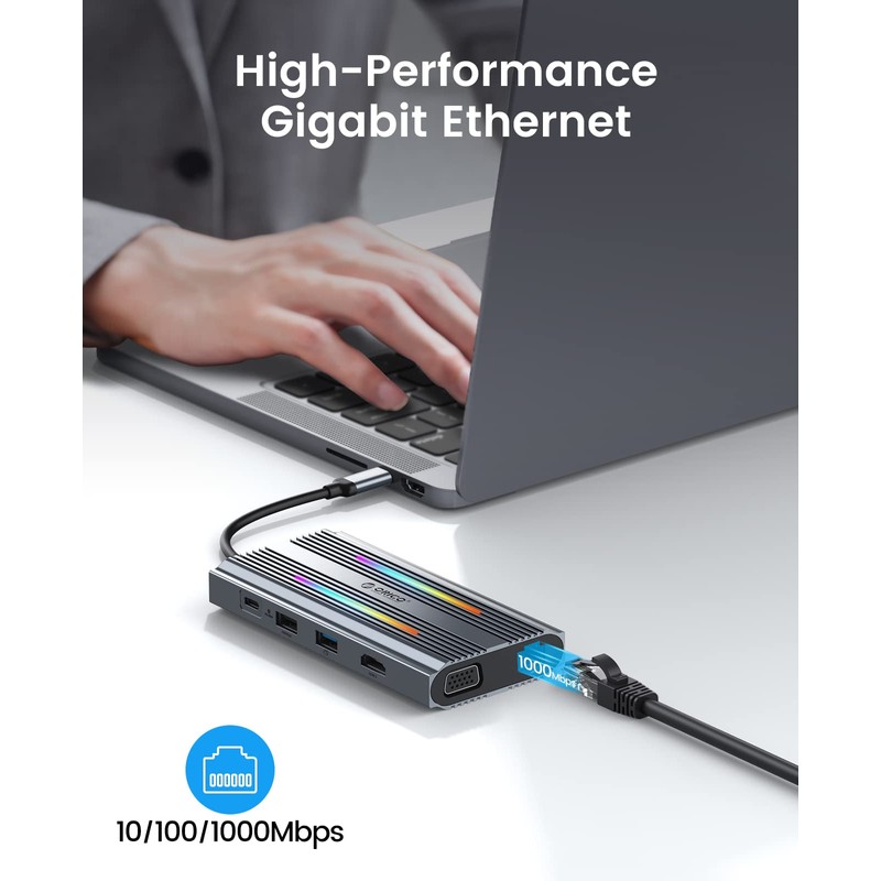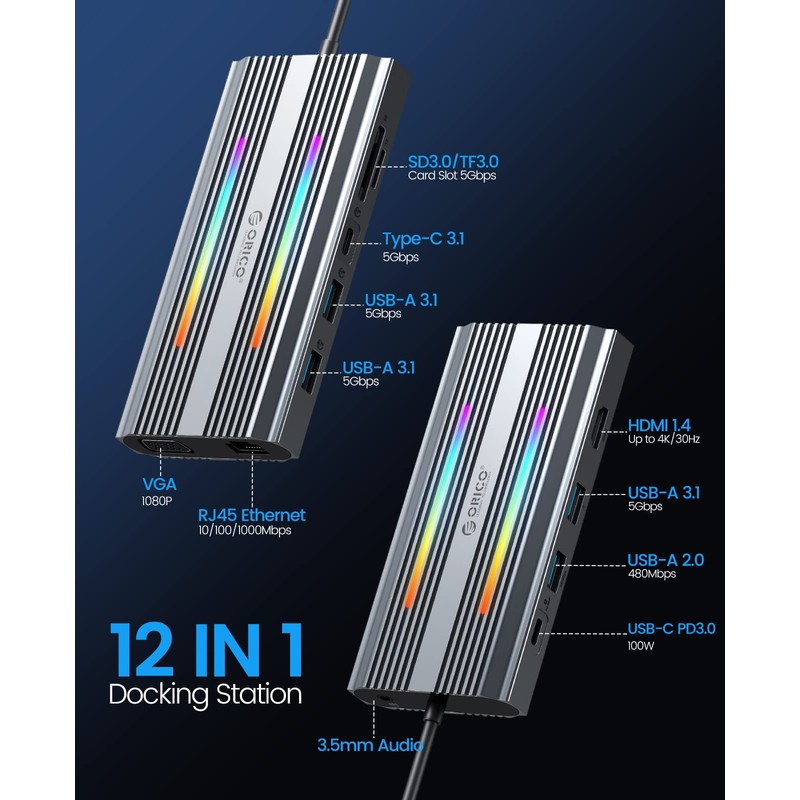 - 【12-in-1 USB C Hub】 ORICO RGB Docking Station has 12 functional ports, including 1* PD charging Type-C port (100W max), 1* HDMI port (4K@30Hz), 1* VGA port (1080P), 3*USB-A3.1 ports, 1*USB-A2.0 port, 1* Data Transfer Type-C port ,1 Gigabit Ethernet port, SD&TF card reader interface and 3.5mm Audio. Meet a variety of expansion needs, office and entertainment are not delayed.