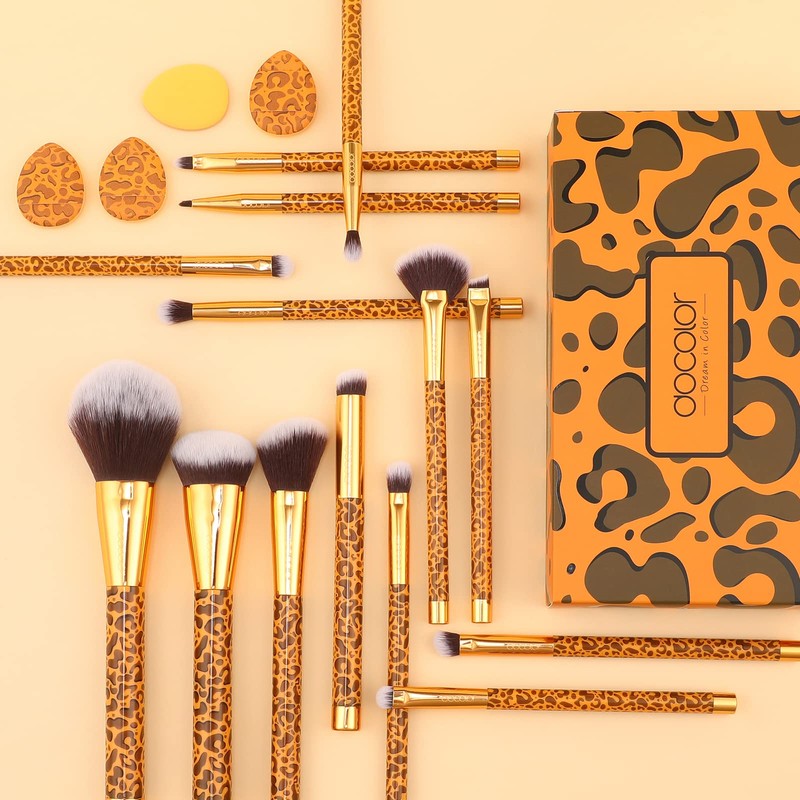 Docolor Makeup Brushes Leopard 14pcs Premium Synthetic Foundation Powder Concealers Eye shadows Blush Makeup Brush Set with 4pcs Makeup Puffs