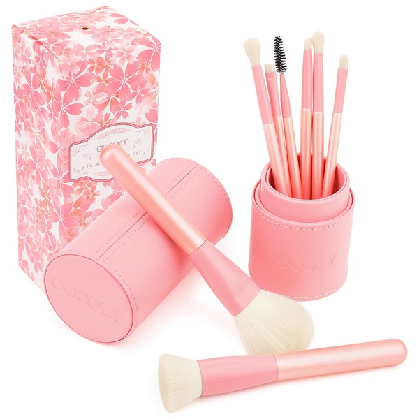Docolor Makeup Brushes Set with Holder 8 Pieces Essential Makeup Brushes Kit Powder Foundation Kabuki Eyeshadow Brush Set, Comfortable to Hold and Easy to Use - Cherry Blossom Series
