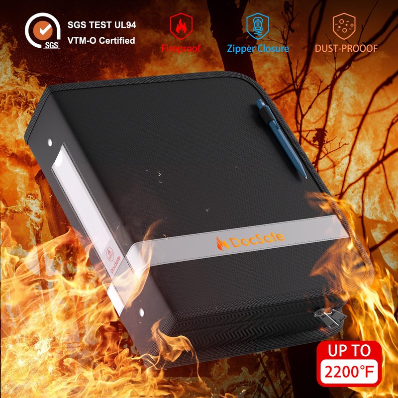 • High-quality Fireproof Materials: Compared with other binders, Our DocSafe fireproof 3 ring binder is made of 3-layered non-itchy silicone-coated fiberglass which withstand the temperature up to 2200℉(Perfect zipper protection). It has been passed by SGS TEST(UL94 VTM-0 Certified). It's great for keeping birth certificates,socialsecurity cards,passports,bank documents,living trusts and wills,family heirlooms and pictures safe. Giving you time to save your important item when disaster strikes.