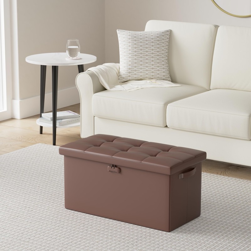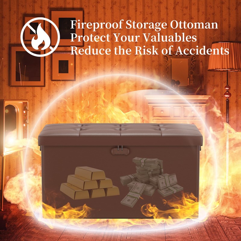DocSafe Storage Ottoman Bench with Lock,Fireproof Folding Storage Bench Foot Rest Stool Storage Chest with Storage Safe for Important Documents,Waterproof Leather 30 Inches Ottoman with Handles,Brown