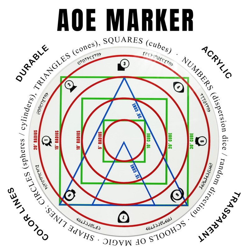 - AOE template to measure the areas of effects and accurately identify which figure or creature is affected. The stencil has lines of different sizes and colours to measure from the area of a fireball to the breath of a dragon. The template is numbered and decorated with symbols that reflect the vile magic schools so you can use it to get a magical direction or type of effects.