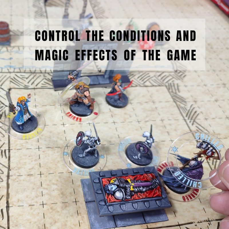 - 140 rings for up to 34 different effects of conditions and magic (4 rings per effect) and another set of 4 blank rings to write any other effect with dry erase markers. Each set has its own colour and icon to distinguish it and quickly view the reference sheet. The rings have an outer diameter of 39 mm with an inner hole of 26 mm, so they can be placed on both 25 mm steps and in different parts of the miniatures.