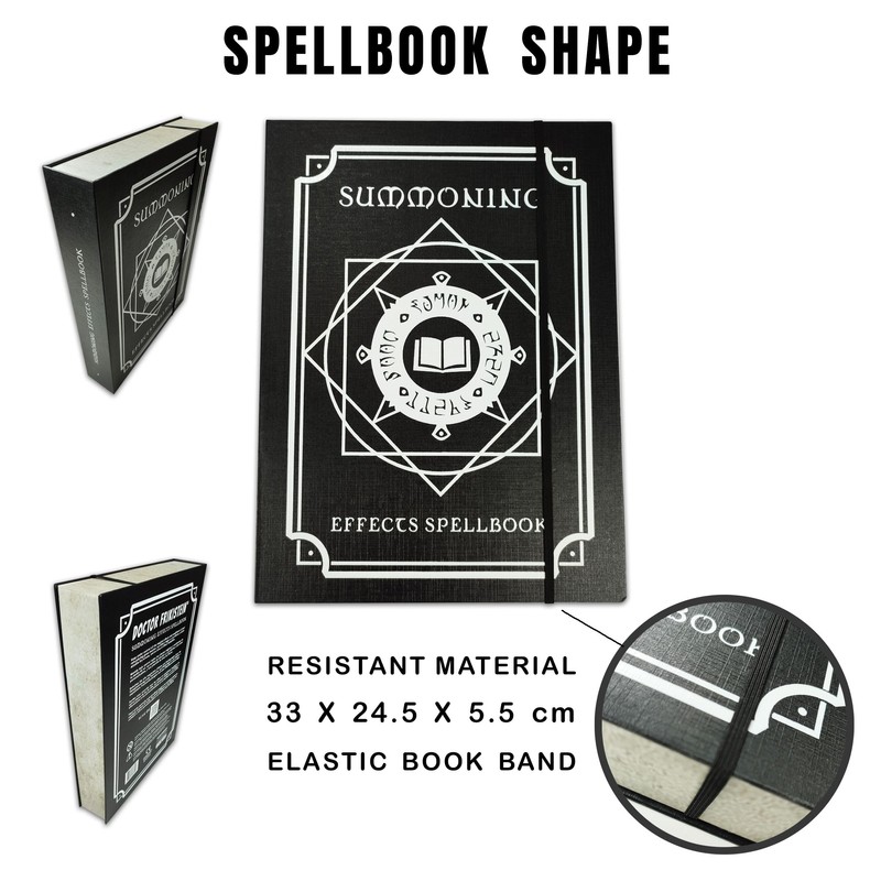 - Box in the shape of a spell book made of durable material with references and boxes to sort all the contents. The box has a serious and plain exterior design with elastic band and inside in full color. What better accessory for magical effects than a spell book? Fantasy is the key to opening the doors of magic. Flood your games with magic and get to the next level!