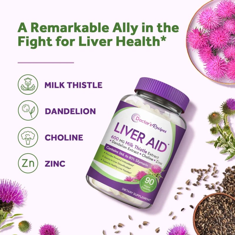 - 4 Premium Liver-Supporting Ingredients*: Our liver health formula contains a synergistic blend — milk thistle seed 30:1 extract (standardized 80% silymarin), dandelion root 4:1 extract, choline bitartrate and zinc picolinate. With these active botanicals and compunds working in tandem, Doctor's Recipes Liver Aid helps strengthen the detoxification pathways of the liver to flush out toxins and byproducts of the body’s everyday processes, taking a huge burden off your main filtration organ.*