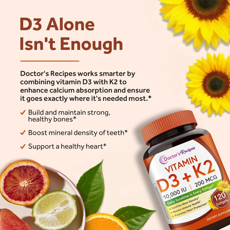 Doctor's Recipes Vitamin D3 K2, 10,000 IU, 200 mcg, MK-7, Strong Bone Density, Teeth, Immune, Heart Support, Energy, Calcium Absorption, No Soy & Gluten, Non-GMO, 120 Softgels