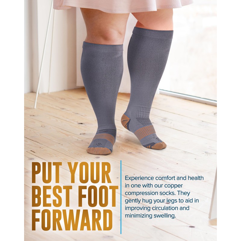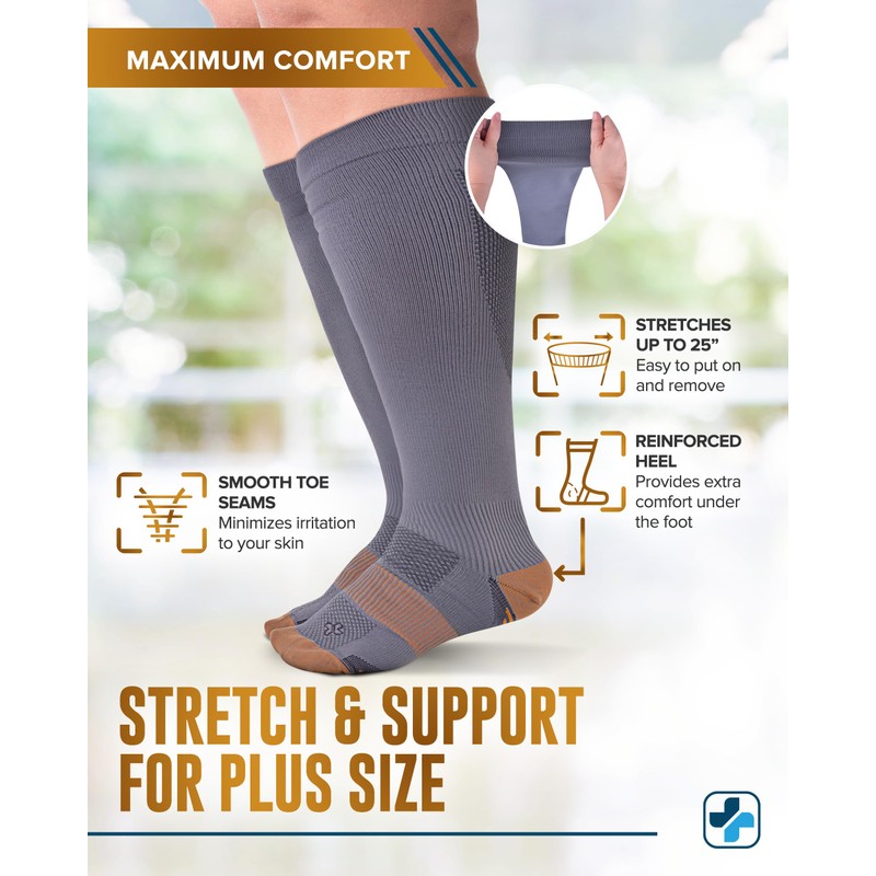 Doctor's Select Copper Plus Size Compression Socks Wide Calf - 2 Pairs | 20-30mmHg Extra Wide Calf Compression Socks Women | Wide Calf Compression Socks Women Plus Size | Copper Compression Socks Plus Size for Traveling & Running | Gray & Navy