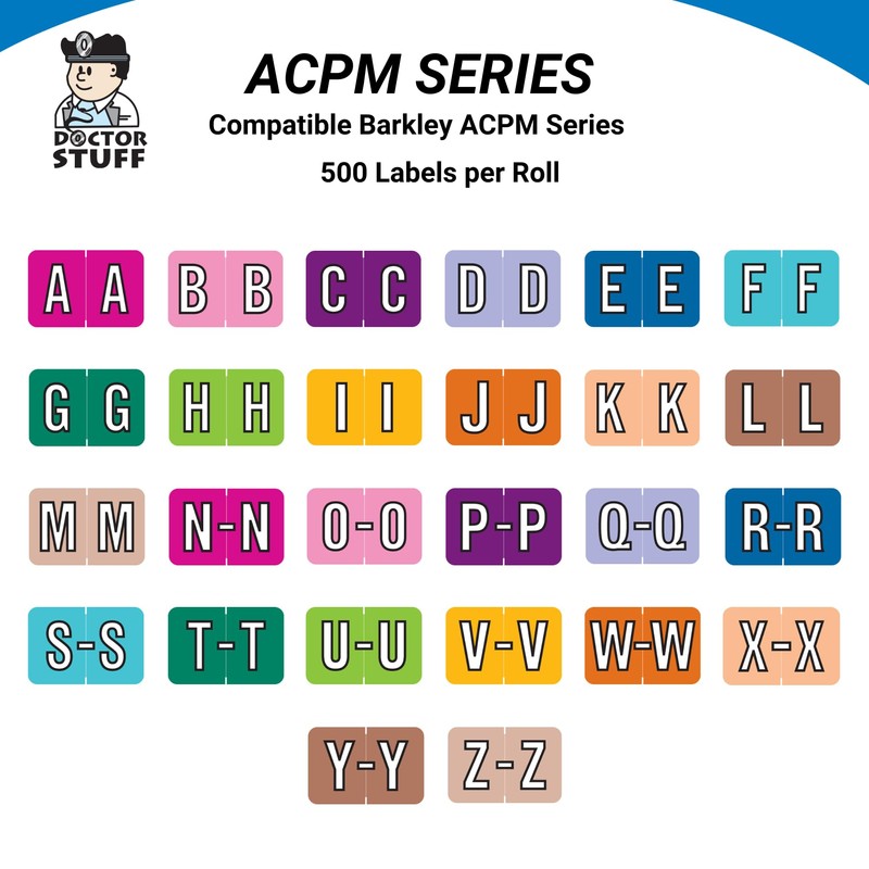 - PERFECTLY ORGANIZED: Doctor Stuff is a leading supplier of folder supplies and our labels are printed with bright colors to match the Barkley ACPM Series alpha labels. They have a clear laminate to keep your labels clean and the colors bright - even with frequent handling.