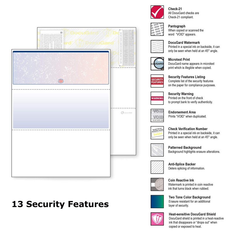 - DocuGard blue/red prismatic top business checks utilize 13 comprehensive security features recommended by the National Check Fraud Center and are ANSI compliant