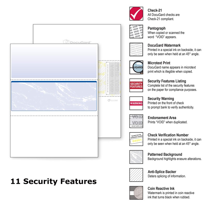 DocuGard utilizes the most comprehensive security features recommended by the national check fraud center to keep you protected. DocuGard business security checks are check 21 compliant and provide highly secure documents at an outstanding value. The standard marble checks are compatible with most money management software and include 11 security features: a "void" pantograph that will appear when copied, marble patterned background, a security features listing, microtext printing, a DocuGard watermark, coin reactive ink on watermark, verification number, "void" pantograph behind the endorsement that will appear when copied, an anti-splice backer, check 21 compliancy and a security warning on the front of the check.