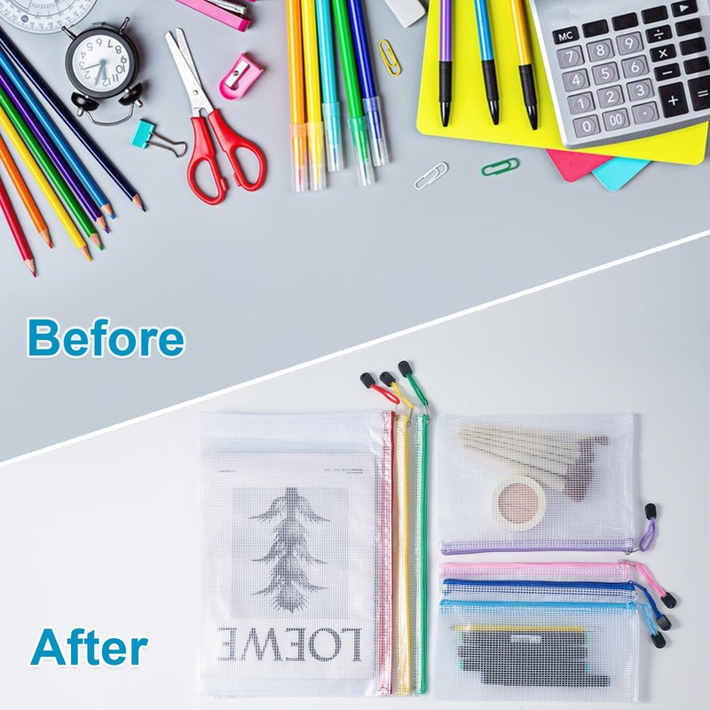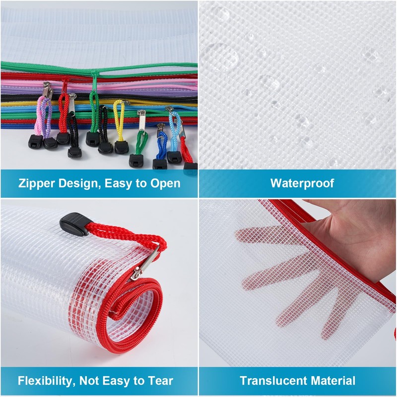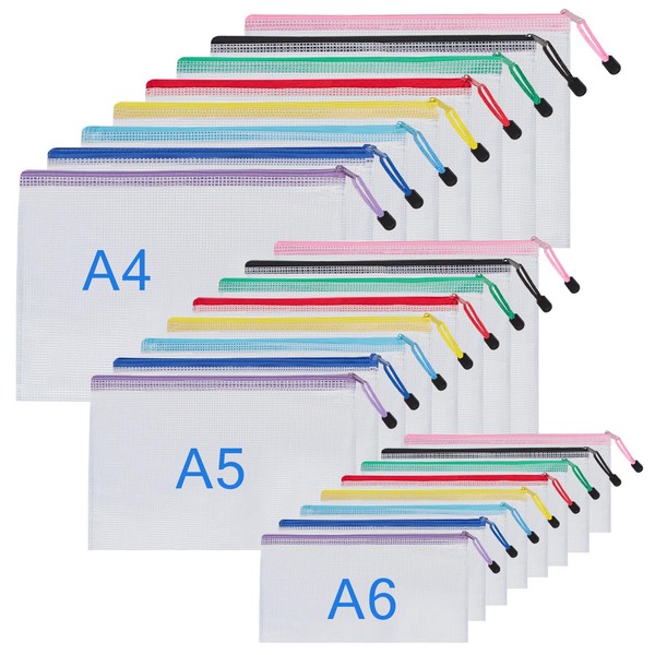 - 24 x document bags: 24 x waterproof document bags, 3 sizes (A4 x 8, A5 x 8, A6 x 8), 8 colours. A4/A5/A6 file bags can only store paper in A4/A5/A6 format or smaller. Please confirm the product size before purchasing.