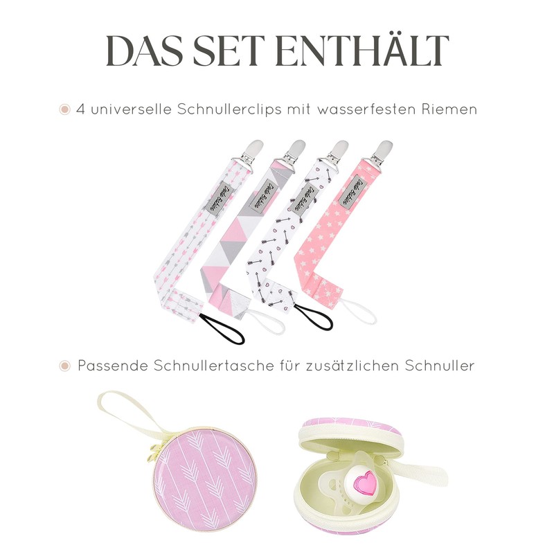 • Easy and safe: our user-friendly dummy straps are made of durable, water-repellent polyester. At one end there is a universal strap that fits most silicone pacifiers, pacifiers and teething toys. On the other end there is a metal clip closure that can be securely attached to bibs or other garments while protecting the fabric.
