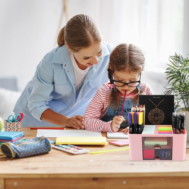 DoDuo Schreibtisch Organizer, Plastik Stifthalter Schreibtisch 5 Fächer und 2 Schubladen, Multifunktionaler Desk Organizer Aesthetic für Stifte Büro Zuhause Schule (Rosa)