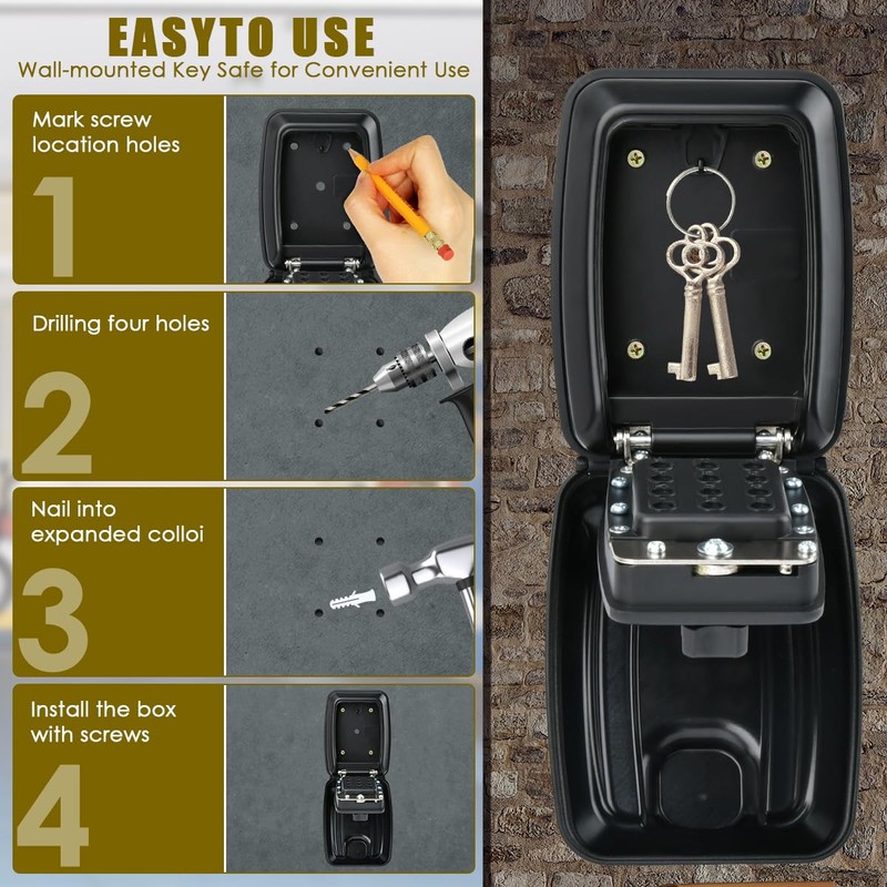 - Easy installation: the key box with code can be easily mounted on a stable surface. With all included installation components, including 4 screws and 4 nylon expansion screws, the key storage box is easy to open when the correct numbers are entered.