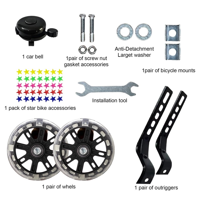 - EFFORTLESS INSTALLATION Our jockey wheel set comes complete with all necessary installation tools and accessories. This comprehensive package ensures quick and hassle-free installation of the stabilisers on your child's bike, so they can ride on the road with confidence in no time at all