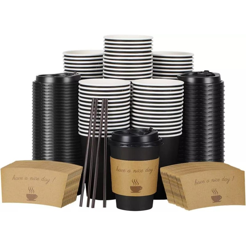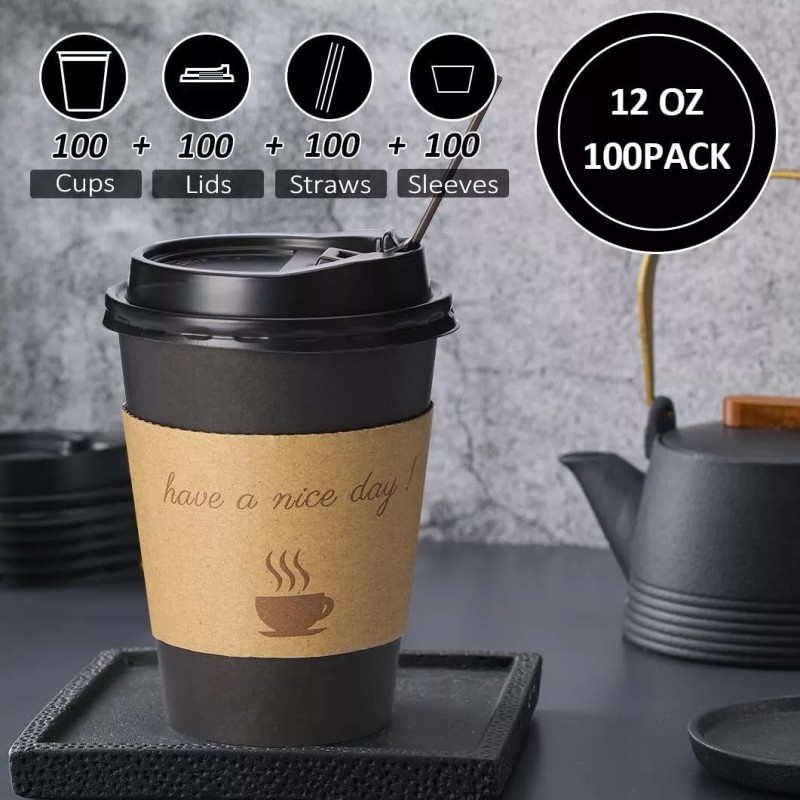 - Great Value Bulk: You will receive 100 coffee cups with black bodies, 100 packs of black matching lids, 100 kraft paper filled cup sleeves, and 100 straws; 12 ounce coffee cup fits most cup holders and single cup coffee makers