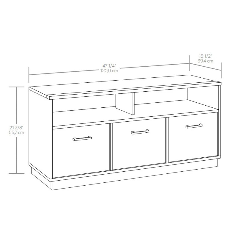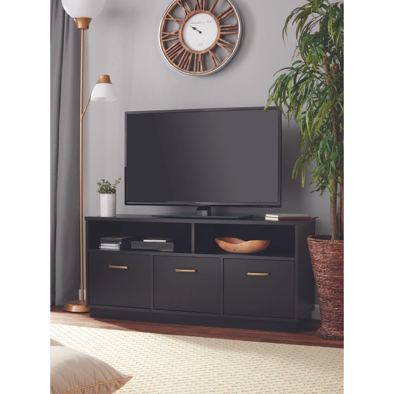 The Mainstays 3-Door Blackwood TV Stand Console for TVs up to 50" is here to give your living room decor a fresh new look. With its simplistic style and modern design, the aesthetic in any room is elevated. This stand accommodates a flat screen TV up to 50" or 50 pounds in weight, making it a great addition to your home for when you want to cozy up and binge watch your favorite shows or have all-day movie marathons. It features two open shelves that offer optimal space to store and hold your sound, video, and gaming consoles, as well as it also makes a nice place to display home decor items like picture frames and knick-knacks. Three large drawers that open and close on smooth metal runners are easily accessible on the front and make for an ideal spot to place a variety of different items. Complete with a Blackwood finish and detailed with stylish hardware, the beautiful Mainstays 3-Door TV Stand Console for TVs up to 50" gives your home the style you want with the functionality you need.