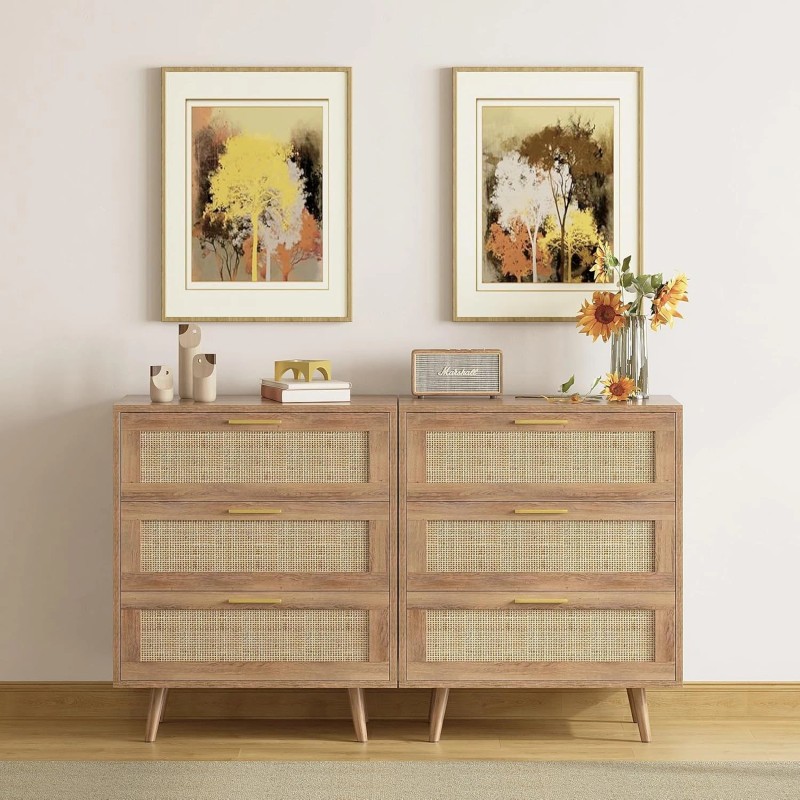 - Rattan Dresser for Bedroom: This rattan dresser is designed with engineered wood and equipped with smooth surface, gold metal handles and eye-catching rattan decoration,matches well with stylish, rustic, country or farmhouse furniture. Make your living space more elegant