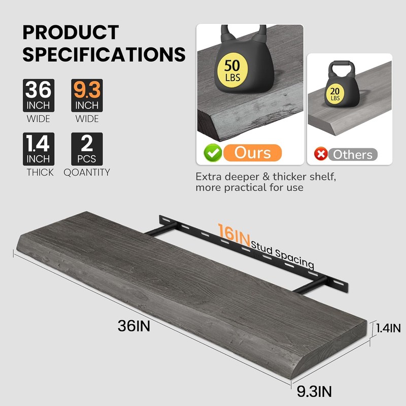 36 Inch Floating Shelves, Live Edge 9.3" Deep Wall Shelves for Storage, Wall-Mou